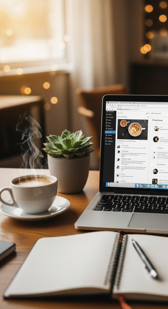 “Writer typing blog post on smartphone, notebook and coffee beside, cozy workspace illustration”